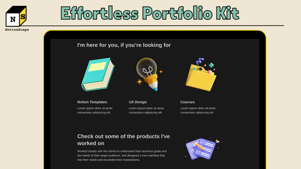 The Effortless Portfolio Kit, the ultimate solution to transform your portfolio presentation. Designed with simplicity in mind, this kit empowers you to create a stunning portfolio without the hassle. Whether you're an artist, designer, writer, or professional of any kind, our kit will help you elegantly showcase your work and achievements.